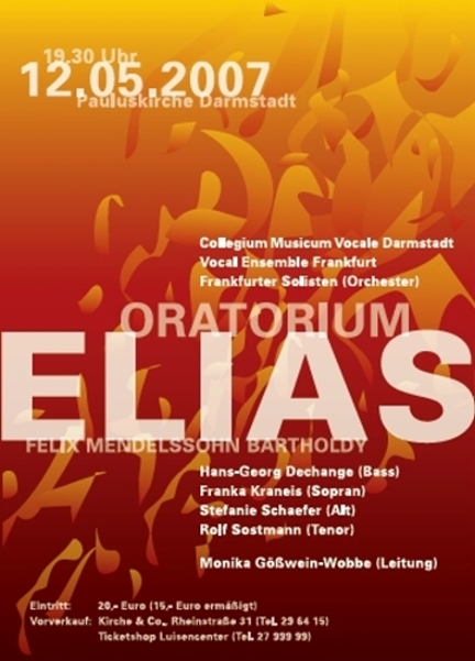 ELIAS von Felix Mendelssohn Bartholdy Samstag, 12. Mai 2007, 19.30 Uhr Sonntag, 13. Mai 2007, 18.00 Uhr Die Aufführung ist als CD vorhanden. Mendelssohn lebte von 1809 bis 1847. Die Uraufführung seines ELIAS leitete er selbst am 26.8.1846 in Birmingham. Vorbild sind Händels biblische Oratorien mit dichtem Wechsel von Chor und Soli.